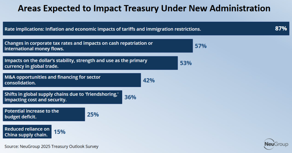 President Trump’s announcement last Saturday of 25% tariffs on imports from Mexico and Canada seemed to confirm the expectations of the vast majority (87%) of respondents to NeuGroup’s 2025 Treasury Outlook Survey who said tariffs would have the greatest impact on them of any changes under the new administration (see chart).